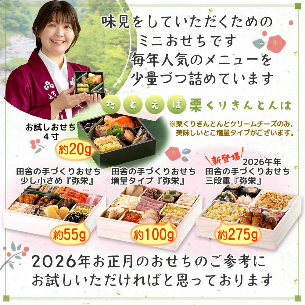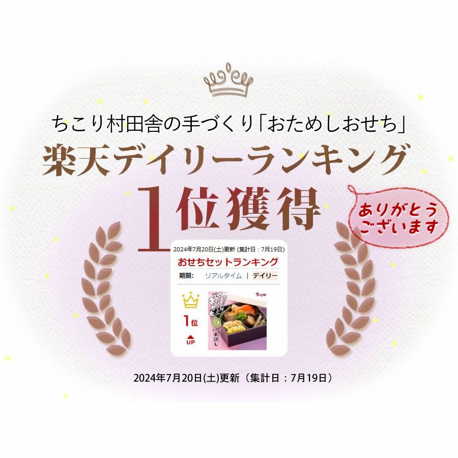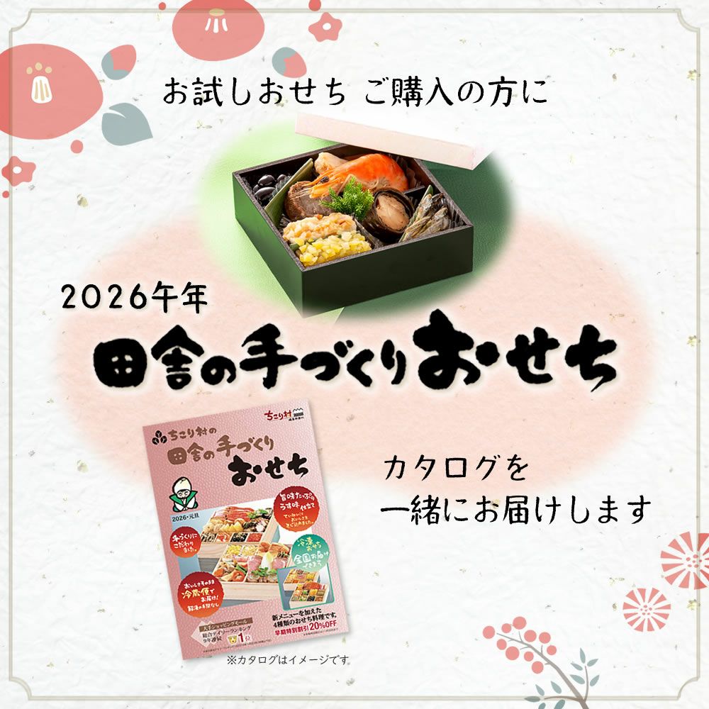 他の画像を見る 在庫切れ 冷凍便でお届け 【おためし用プチサイズ】 ちこり村 田舎の手づくりおせちお試し おせち 【人気8品】 冷凍 当店通常価格 ¥ 1,000 のところ 販売価格 ¥ 950 税込 販売を終了しました。 4.62 (29) 詳細を見る お気に入りに登録する