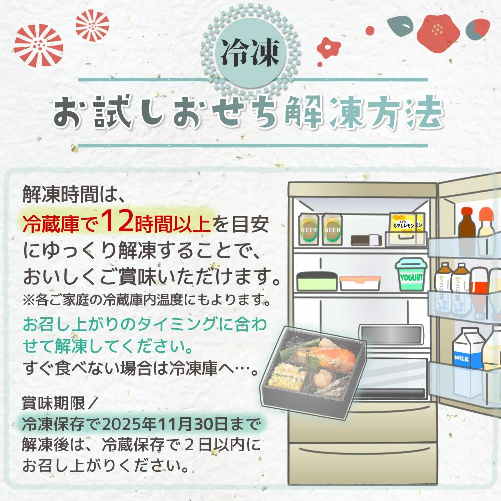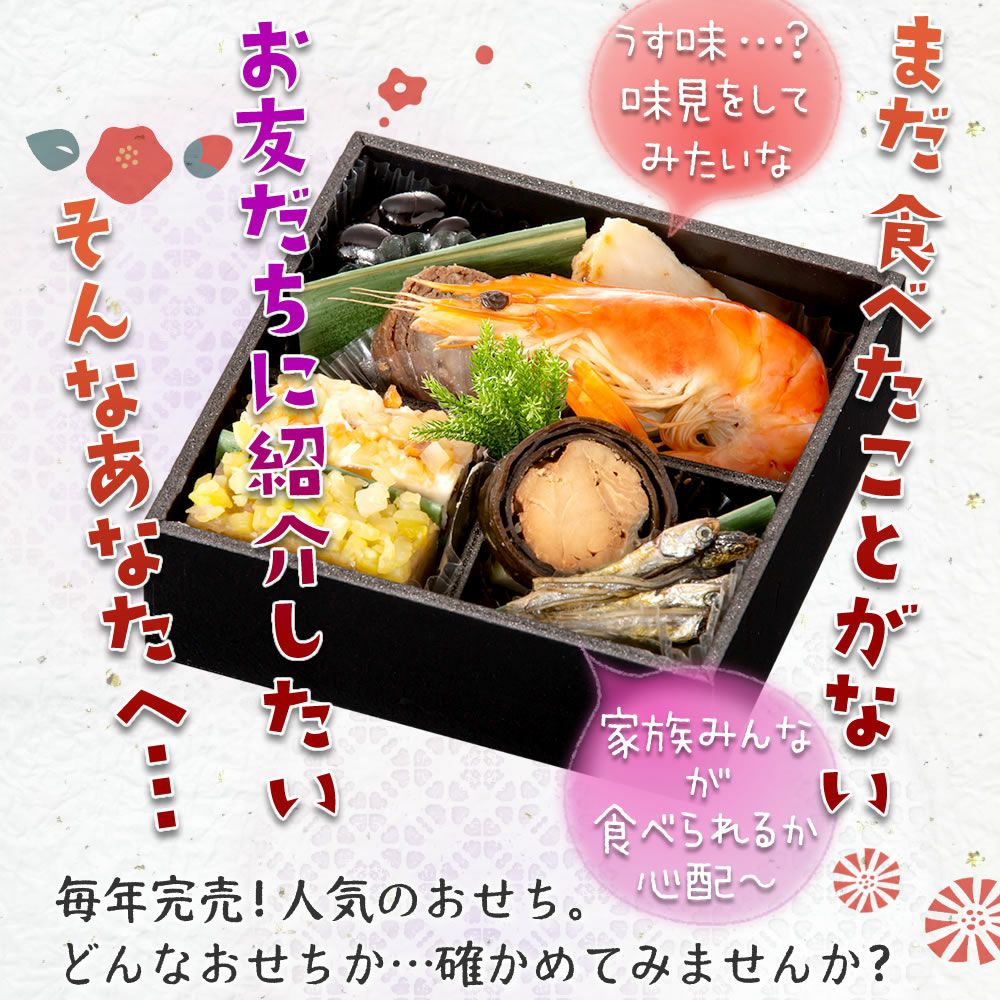 他の画像を見る 在庫切れ 冷蔵便でお届け/薄口ながら旨味たっぷり♪ ◆インターネット◆WEB限定◆おせち 2026 冷蔵便でお届け♪ ちこり村 田舎の手づくりおせち【煮物の入った人気2品増量&チコリ入り】二段重3~4人前 送料無料 着日指定不可 冷蔵 送料無料 販売価格 ¥ 25,000 税込 販売を終了しました。 4.88 (8) 詳細を見る お気に入りに登録する
