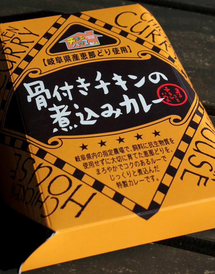 玉ねぎ、鶏肉(岐阜県産)、トマトペースト、小麦粉、鶏がらスープ、食用調合油、牛乳、ラード、砂糖、マンゴーチャツネ、リンゴピューレ、ビーフエキス、食塩、カレー粉、にんにく、はちみつ、生姜、ウスターソース、オイスターソース、醤油、香辛料、調味料(アミノ酸)、カラメル色素(原材料の一部に大豆、牛肉、豚肉を含む)