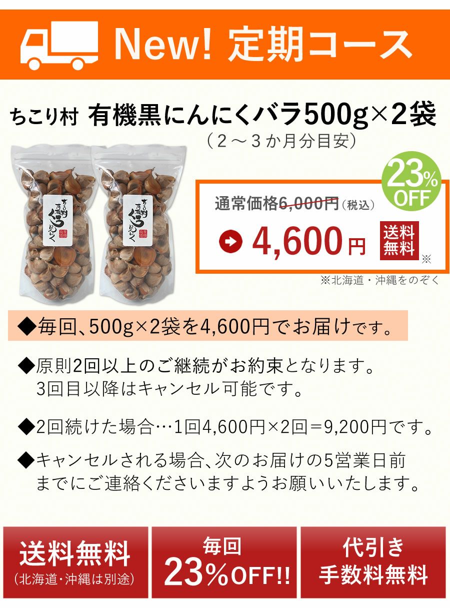 他の画像を見る 【定期コース●23%OFF】ちこり村の有機 黒にんにく 500g×2袋 (バラ)定期的にお届け◆送料無料・代引手数料無料 常温 送料無料 定期販売 1回あたり ¥ 4,600 税込 5.00 (6) 詳細を見る お気に入りに登録する