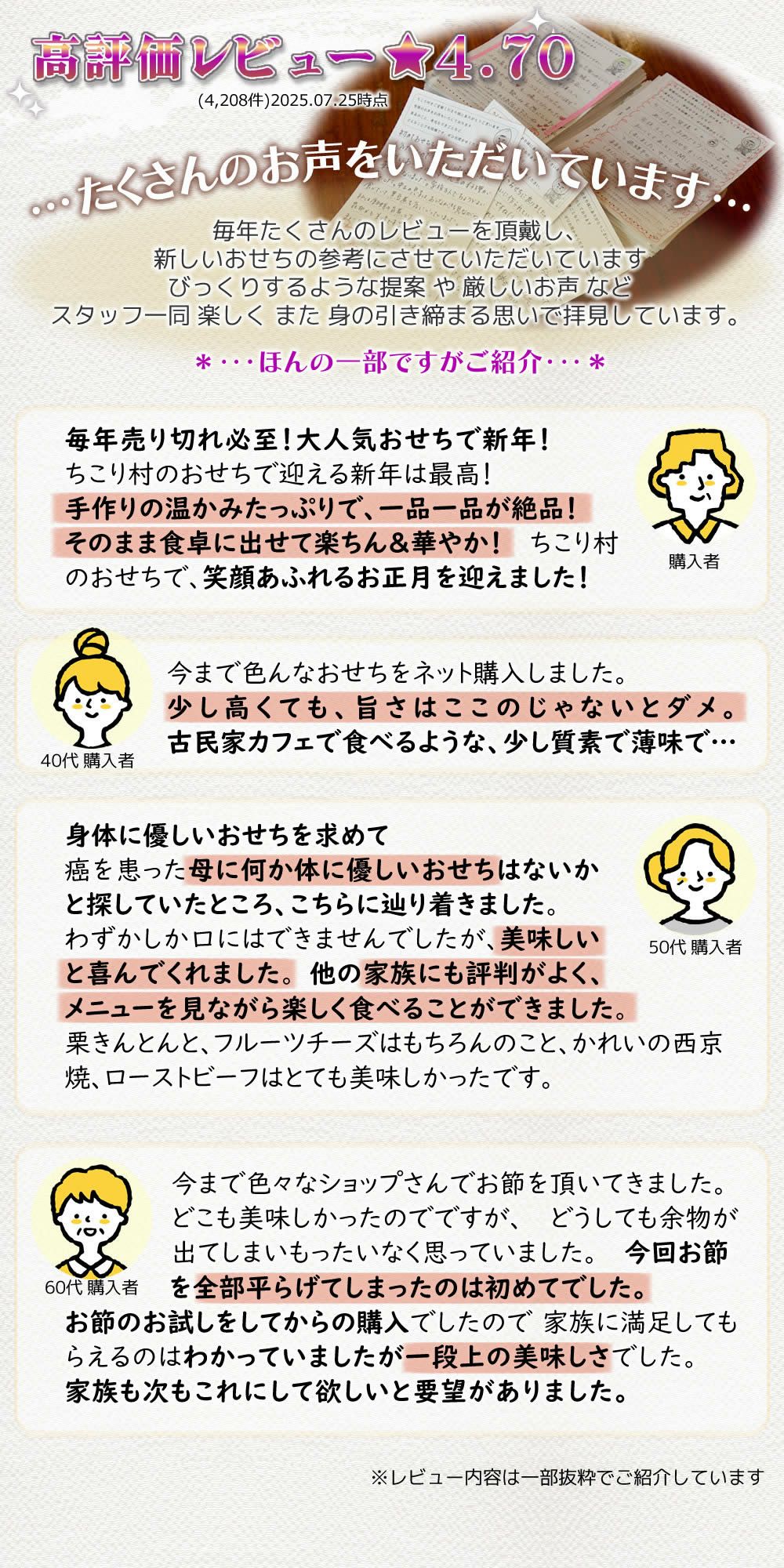 他の画像を見る 在庫切れ 楽天総合ランキング10年連続1位/冷蔵便でお届け/薄味ながら旨味たっぷり♪【お節料理/御節料理/お節/御節/生おせち】 おせち 2026 冷蔵便でお届け♪ ちこり村 田舎の手づくりおせち 【人気2品増量おせち】』二段重 3~4人前 送料無料 着日指定不可 冷蔵 送料無料 販売価格 ¥ 24,570 税込 販売を終了しました。 4.87 (302) 詳細を見る お気に入りに登録する