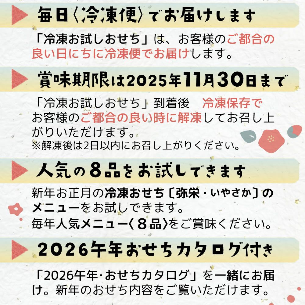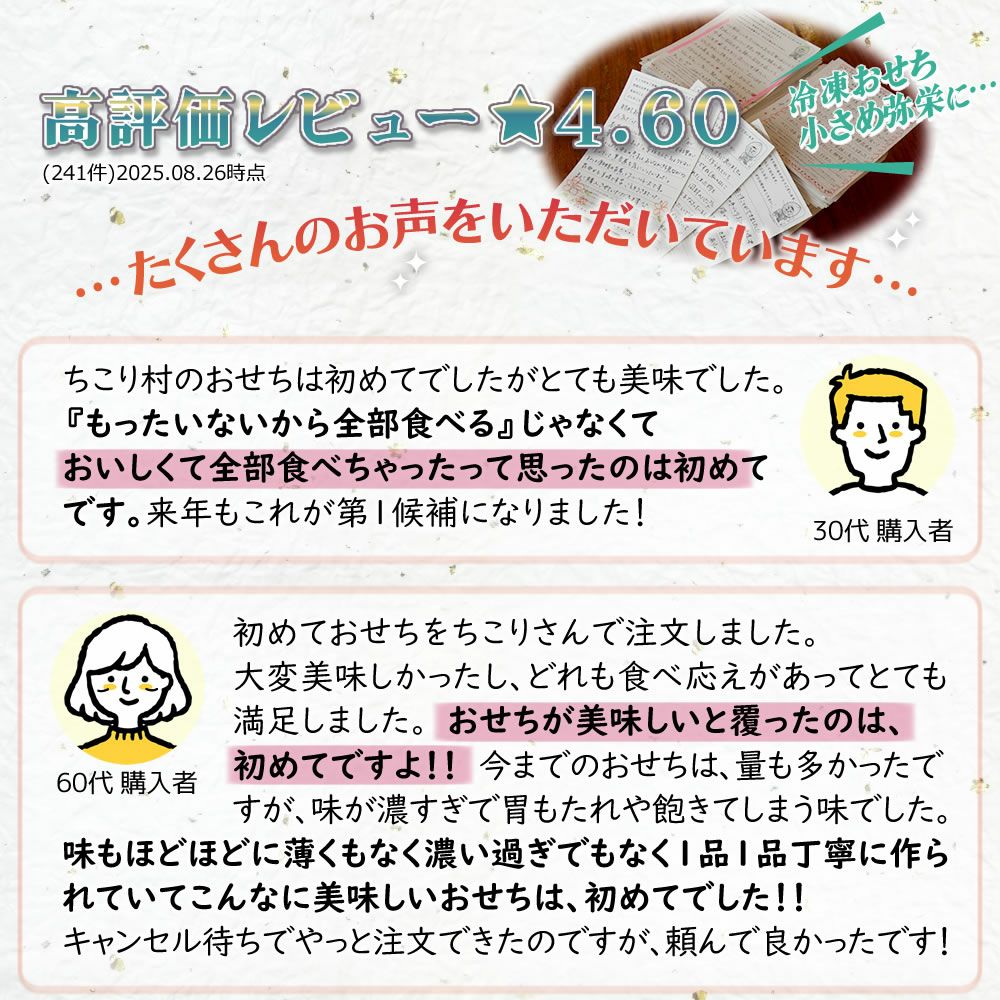 他の画像を見る 在庫切れ 冷凍便でお届け 【おためし用プチサイズ】 ちこり村 田舎の手づくりおせちお試し おせち 【人気8品】 冷凍 当店通常価格 ¥ 1,000 のところ 販売価格 ¥ 950 税込 販売を終了しました。 4.62 (29) 詳細を見る お気に入りに登録する